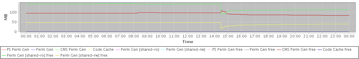 avg(PS Perm Gen) = 0.00 avg(Perm Gen) = 0.00 avg(CMS Perm Gen) = 128.87 avg(Code Cache) = 43.10 avg(Perm Gen [shared-ro]) = 0.00 avg(Perm Gen [shared-rw]) = 0.00 avg(PS Perm Gen free) = 0.00 avg(Perm Gen free) = 0.00 avg(CMS Perm Gen free) = 91.97 avg(Code Cache free) = 0.33 avg(Perm Gen [shared-ro] free) = 0.00 avg(Perm Gen [shared-rw] free) = 0.00