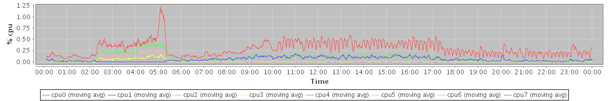 avg(cpu0) = 0.29 avg(cpu1) = 0.05 avg(cpu2) = 0.09 avg(cpu3) = 0.01 avg(cpu4) = 0.00 avg(cpu5) = 0.00 avg(cpu6) = 0.07 avg(cpu7) = 0.00