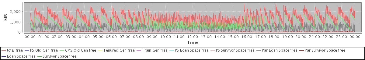 avg(total free) = 1408.86 avg(PS Old Gen free) = 0.00 avg(CMS Old Gen free) = 894.06 avg(Tenured Gen free) = 0.00 avg(Train Gen free) = 0.00 avg(PS Eden Space free) = 0.00 avg(PS Survivor Space free) = 0.00 avg(Par Eden Space free) = 474.93 avg(Par Survivor Space free) = 39.87 avg(Eden Space free) = 0.00 avg(Survivor Space free) = 0.00
