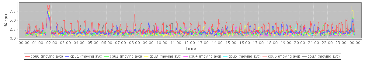 avg(cpu0) = 2.43 avg(cpu1) = 1.82 avg(cpu2) = 1.60 avg(cpu3) = 1.37 avg(cpu4) = 1.42 avg(cpu5) = 1.46 avg(cpu6) = 1.38 avg(cpu7) = 1.61
