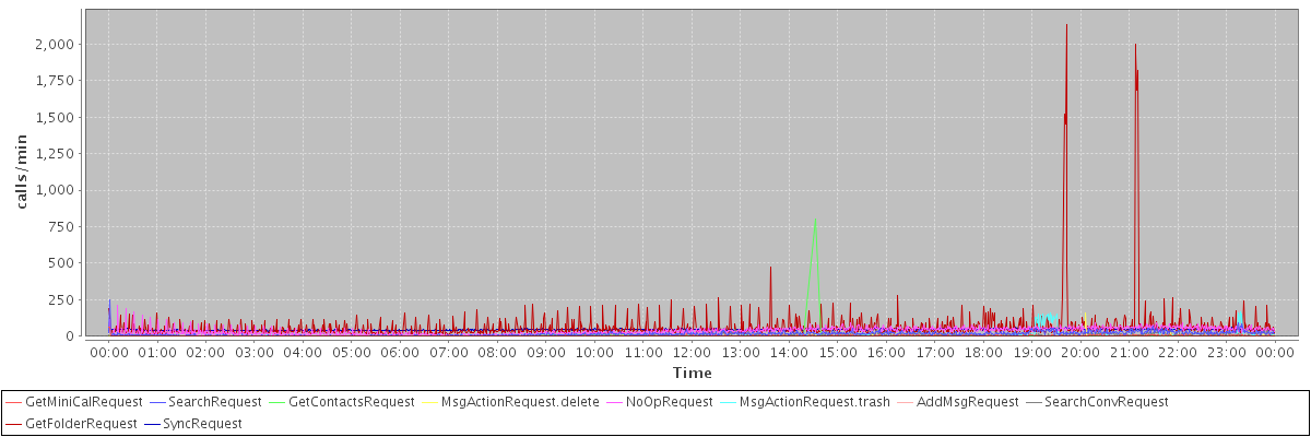 max(GetMiniCalRequest) = 62.00 max(SearchRequest) = 251.00 max(GetContactsRequest) = 799.00 max(MsgActionRequest.delete) = 159.00 max(NoOpRequest) = 212.00 max(MsgActionRequest.trash) = 164.00 max(AddMsgRequest) = 117.00 max(SearchConvRequest) = 61.00 max(GetFolderRequest) = 2134.00 max(SyncRequest) = 64.00