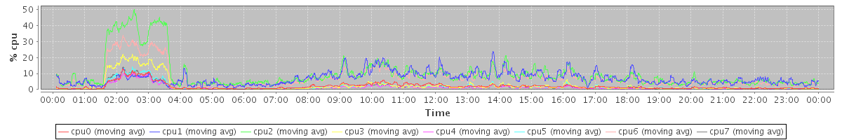 avg(cpu0) = 1.30 avg(cpu1) = 0.41 avg(cpu2) = 0.47 avg(cpu3) = 0.34 avg(cpu4) = 0.23 avg(cpu5) = 0.30 avg(cpu6) = 0.31 avg(cpu7) = 0.27