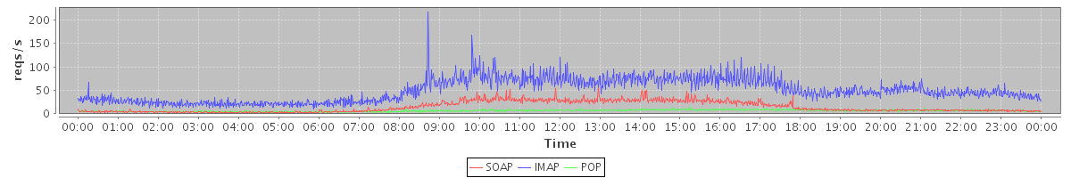 Host zm03.stanford.edu: Mailboxd: Request Rate by Client Protocol