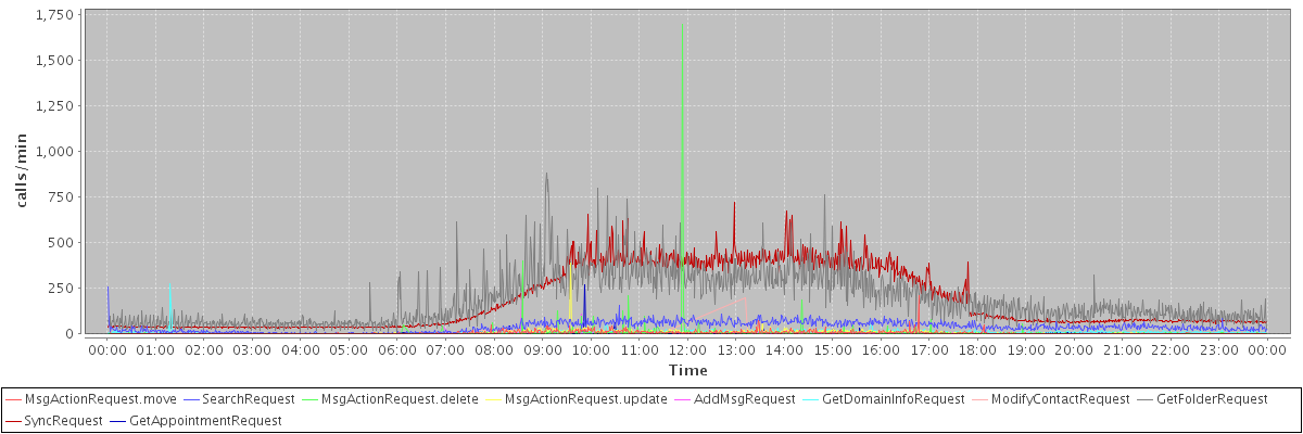 max(MsgActionRequest.move) = 213.00 max(SearchRequest) = 256.00 max(MsgActionRequest.delete) = 1698.00 max(MsgActionRequest.update) = 387.00 max(AddMsgRequest) = 226.00 max(GetDomainInfoRequest) = 275.00 max(ModifyContactRequest) = 201.00 max(GetFolderRequest) = 882.00 max(SyncRequest) = 724.00 max(GetAppointmentRequest) = 268.00