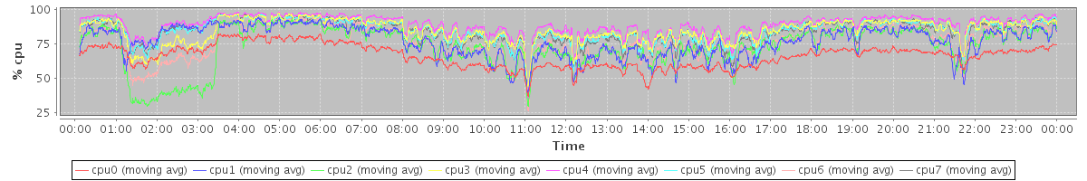 avg(cpu0) = 66.37 avg(cpu1) = 76.79 avg(cpu2) = 73.01 avg(cpu3) = 84.74 avg(cpu4) = 88.90 avg(cpu5) = 84.61 avg(cpu6) = 76.12 avg(cpu7) = 83.95