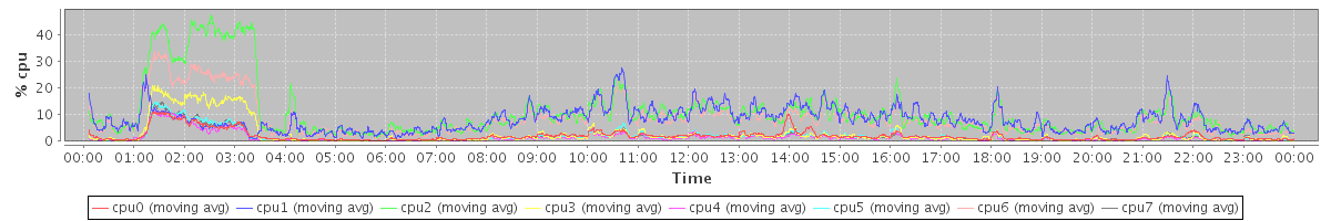 avg(cpu0) = 1.36 avg(cpu1) = 0.40 avg(cpu2) = 0.48 avg(cpu3) = 0.37 avg(cpu4) = 0.24 avg(cpu5) = 0.33 avg(cpu6) = 0.33 avg(cpu7) = 0.31