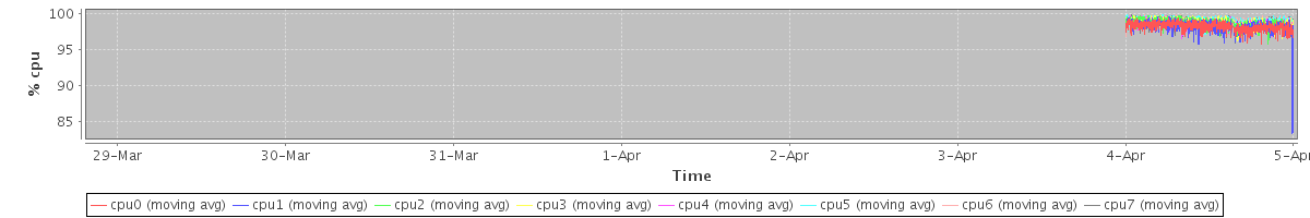 avg(cpu0) = 98.19 avg(cpu1) = 98.16 avg(cpu2) = 98.56 avg(cpu3) = 98.69 avg(cpu4) = 98.59 avg(cpu5) = 98.89 avg(cpu6) = 98.83 avg(cpu7) = 98.63