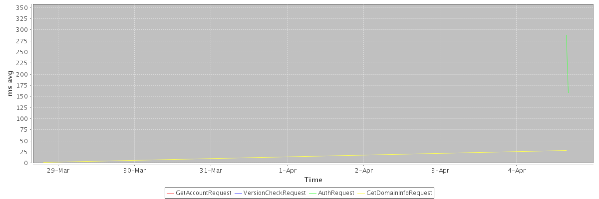 avg(GetAccountRequest) = 86.00 avg(VersionCheckRequest) = 341.00 avg(AuthRequest) = 223.00 avg(GetDomainInfoRequest) = 7.25