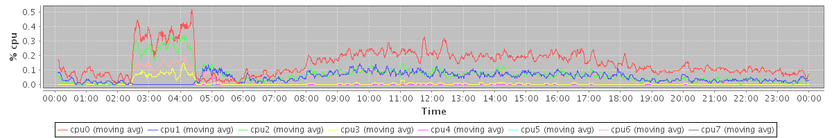 avg(cpu0) = 1.61 avg(cpu1) = 0.43 avg(cpu2) = 0.45 avg(cpu3) = 0.36 avg(cpu4) = 0.23 avg(cpu5) = 0.25 avg(cpu6) = 0.34 avg(cpu7) = 0.28