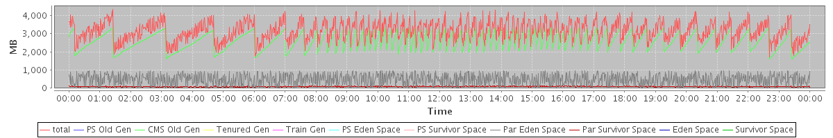 avg(total) = 3154.74 avg(PS Old Gen) = 0.00 avg(CMS Old Gen) = 2578.82 avg(Tenured Gen) = 0.00 avg(Train Gen) = 0.00 avg(PS Eden Space) = 0.00 avg(PS Survivor Space) = 0.00 avg(Par Eden Space) = 488.64 avg(Par Survivor Space) = 87.28 avg(Eden Space) = 0.00 avg(Survivor Space) = 0.00