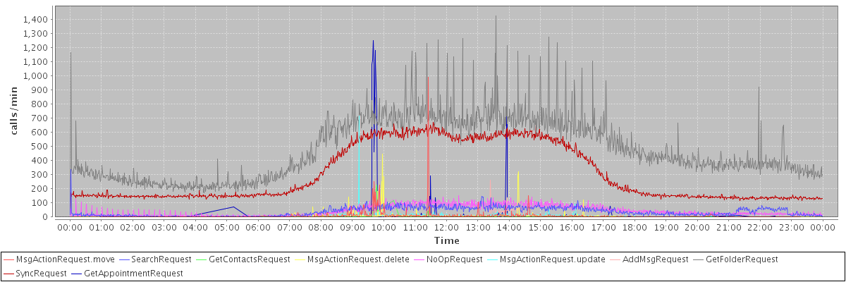 max(MsgActionRequest.move) = 993.00 max(SearchRequest) = 335.00 max(GetContactsRequest) = 224.00 max(MsgActionRequest.delete) = 448.00 max(NoOpRequest) = 154.00 max(MsgActionRequest.update) = 716.00 max(AddMsgRequest) = 261.00 max(GetFolderRequest) = 1427.00 max(SyncRequest) = 669.00 max(GetAppointmentRequest) = 1249.00