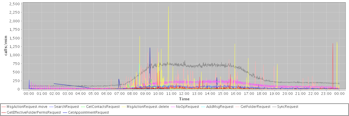 max(MsgActionRequest.move) = 1344.00 max(SearchRequest) = 272.00 max(GetContactsRequest) = 289.00 max(MsgActionRequest.delete) = 2424.00 max(NoOpRequest) = 320.00 max(AddMsgRequest) = 747.00 max(GetFolderRequest) = 1197.00 max(SyncRequest) = 844.00 max(GetEffectiveFolderPermsRequest) = 227.00 max(GetAppointmentRequest) = 1214.00