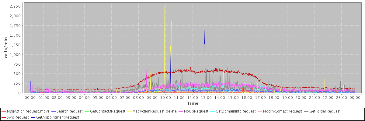 max(MsgActionRequest.move) = 504.00 max(SearchRequest) = 306.00 max(GetContactsRequest) = 300.00 max(MsgActionRequest.delete) = 2237.00 max(NoOpRequest) = 619.00 max(GetDomainInfoRequest) = 311.00 max(ModifyContactRequest) = 215.00 max(GetFolderRequest) = 792.00 max(SyncRequest) = 668.00 max(GetAppointmentRequest) = 1625.00