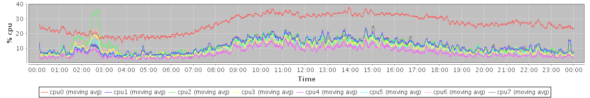 avg(cpu0) = 1.44 avg(cpu1) = 0.43 avg(cpu2) = 0.53 avg(cpu3) = 0.36 avg(cpu4) = 0.23 avg(cpu5) = 0.28 avg(cpu6) = 0.35 avg(cpu7) = 0.31