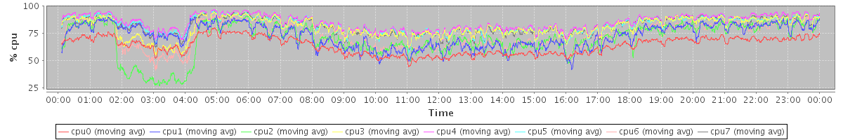 avg(cpu0) = 63.60 avg(cpu1) = 72.52 avg(cpu2) = 69.21 avg(cpu3) = 80.54 avg(cpu4) = 84.55 avg(cpu5) = 82.35 avg(cpu6) = 72.12 avg(cpu7) = 81.95