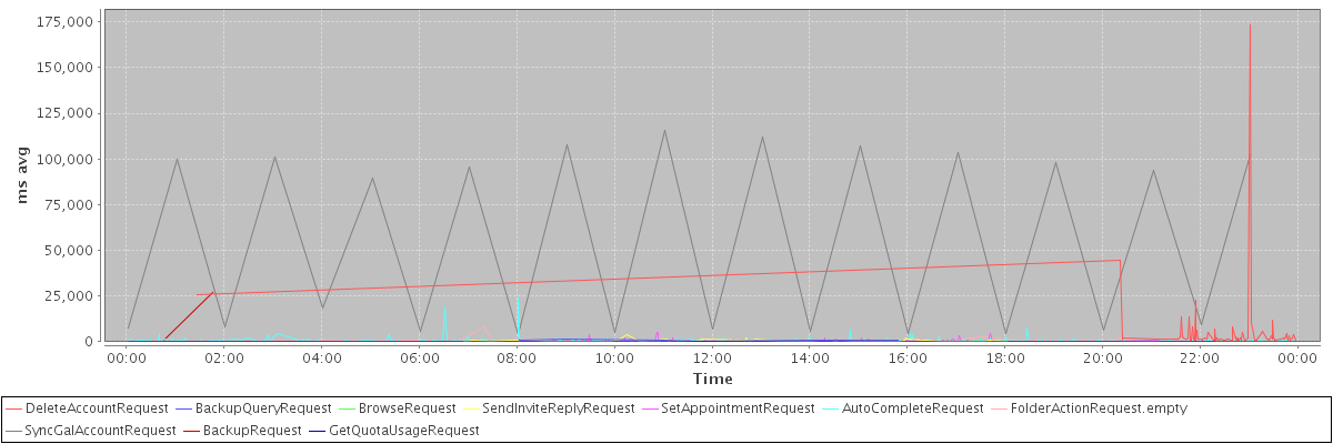 avg(DeleteAccountRequest) = 5077.51 avg(BackupQueryRequest) = 861.50 avg(BrowseRequest) = 4777.00 avg(SendInviteReplyRequest) = 656.51 avg(SetAppointmentRequest) = 312.57 avg(AutoCompleteRequest) = 555.24 avg(FolderActionRequest.empty) = 478.05 avg(SyncGalAccountRequest) = 54617.08 avg(BackupRequest) = 13960.00 avg(GetQuotaUsageRequest) = 1368.00