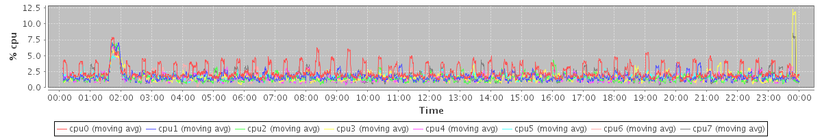 avg(cpu0) = 0.52 avg(cpu1) = 0.32 avg(cpu2) = 0.22 avg(cpu3) = 0.22 avg(cpu4) = 0.28 avg(cpu5) = 0.18 avg(cpu6) = 0.13 avg(cpu7) = 0.12