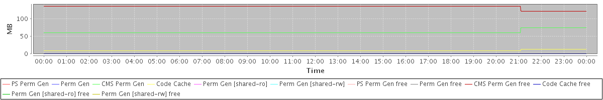 avg(PS Perm Gen) = 0.00 avg(Perm Gen) = 0.00 avg(CMS Perm Gen) = 62.49 avg(Code Cache) = 9.54 avg(Perm Gen [shared-ro]) = 0.00 avg(Perm Gen [shared-rw]) = 0.00 avg(PS Perm Gen free) = 0.00 avg(Perm Gen free) = 0.00 avg(CMS Perm Gen free) = 133.51 avg(Code Cache free) = 0.22 avg(Perm Gen [shared-ro] free) = 0.00 avg(Perm Gen [shared-rw] free) = 0.00