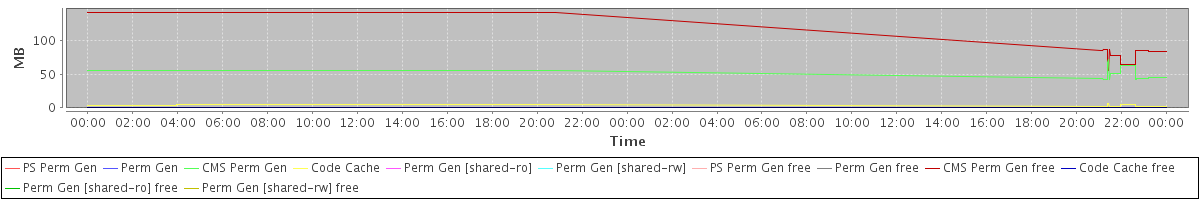 avg(PS Perm Gen) = 0.00 avg(Perm Gen) = 0.00 avg(CMS Perm Gen) = 54.38 avg(Code Cache) = 4.14 avg(Perm Gen [shared-ro]) = 0.00 avg(Perm Gen [shared-rw]) = 0.00 avg(PS Perm Gen free) = 0.00 avg(Perm Gen free) = 0.00 avg(CMS Perm Gen free) = 133.40 avg(Code Cache free) = 0.13 avg(Perm Gen [shared-ro] free) = 0.00 avg(Perm Gen [shared-rw] free) = 0.00