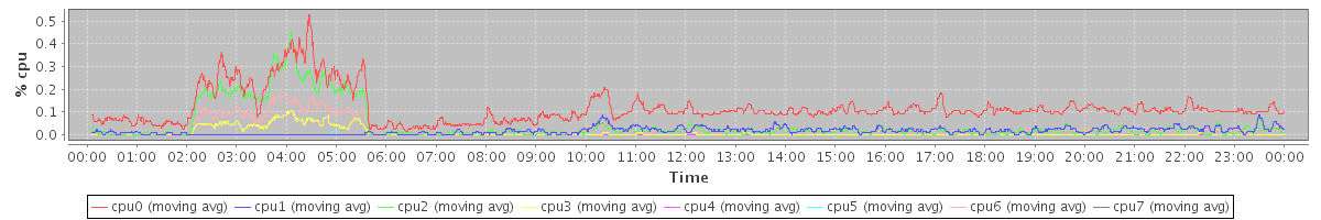 avg(cpu0) = 0.12 avg(cpu1) = 0.01 avg(cpu2) = 0.04 avg(cpu3) = 0.01 avg(cpu4) = 0.00 avg(cpu5) = 0.00 avg(cpu6) = 0.03 avg(cpu7) = 0.00