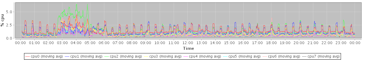avg(cpu0) = 1.21 avg(cpu1) = 0.44 avg(cpu2) = 0.57 avg(cpu3) = 0.32 avg(cpu4) = 0.21 avg(cpu5) = 0.31 avg(cpu6) = 0.28 avg(cpu7) = 0.25