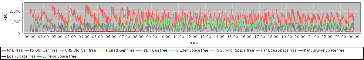 avg(total free) = 1396.62 avg(PS Old Gen free) = 0.00 avg(CMS Old Gen free) = 878.23 avg(Tenured Gen free) = 0.00 avg(Train Gen free) = 0.00 avg(PS Eden Space free) = 0.00 avg(PS Survivor Space free) = 0.00 avg(Par Eden Space free) = 475.02 avg(Par Survivor Space free) = 43.37 avg(Eden Space free) = 0.00 avg(Survivor Space free) = 0.00
