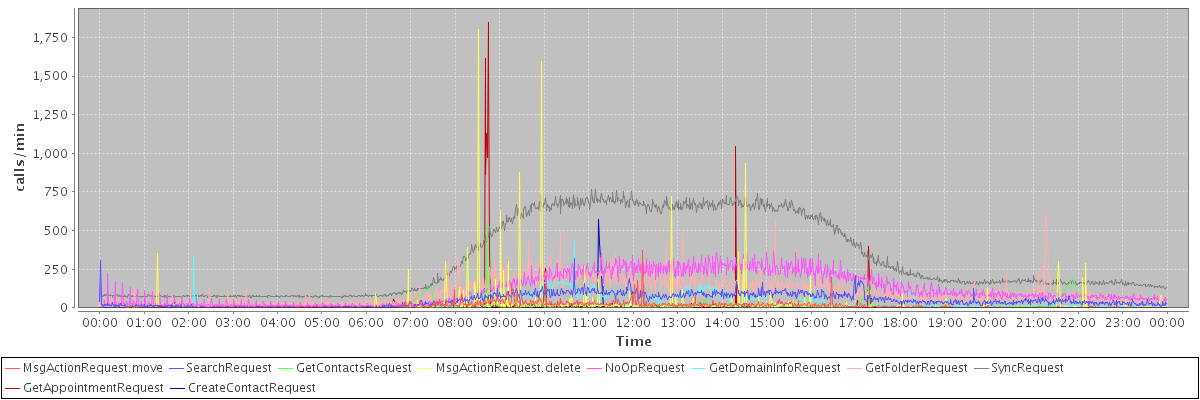 max(MsgActionRequest.move) = 368.00 max(SearchRequest) = 320.00 max(GetContactsRequest) = 558.00 max(MsgActionRequest.delete) = 1800.00 max(NoOpRequest) = 363.00 max(GetDomainInfoRequest) = 429.00 max(GetFolderRequest) = 602.00 max(SyncRequest) = 765.00 max(GetAppointmentRequest) = 1848.00 max(CreateContactRequest) = 574.00