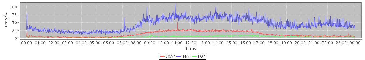 Host zm03.stanford.edu: Mailboxd: Request Rate by Client Protocol
