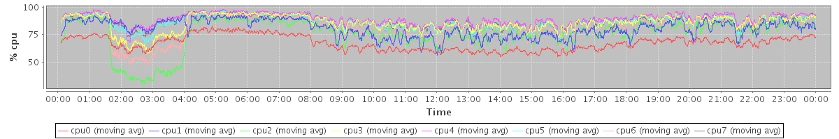 avg(cpu0) = 67.32 avg(cpu1) = 80.31 avg(cpu2) = 75.60 avg(cpu3) = 85.54 avg(cpu4) = 89.20 avg(cpu5) = 86.64 avg(cpu6) = 78.83 avg(cpu7) = 87.07