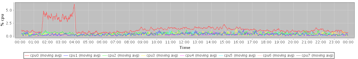 avg(cpu0) = 1.38 avg(cpu1) = 0.34 avg(cpu2) = 0.45 avg(cpu3) = 0.31 avg(cpu4) = 0.23 avg(cpu5) = 0.27 avg(cpu6) = 0.28 avg(cpu7) = 0.24