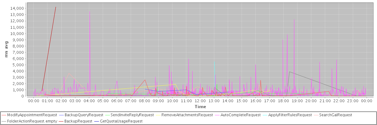 avg(ModifyAppointmentRequest) = 298.82 avg(BackupQueryRequest) = 760.80 avg(SendInviteReplyRequest) = 444.97 avg(RemoveAttachmentsRequest) = 702.73 avg(AutoCompleteRequest) = 576.98 avg(ApplyFilterRulesRequest) = 3492.50 avg(SearchGalRequest) = 620.11 avg(FolderActionRequest.empty) = 366.28 avg(BackupRequest) = 7536.50 avg(GetQuotaUsageRequest) = 4156.00