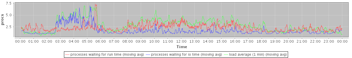 avg(processes waiting for run time) = 1.77 avg(processes waiting for io time) = 1.01 avg(load average (1 min)) = 2.88