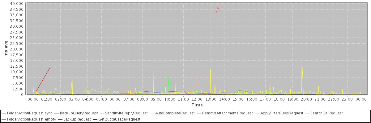 avg(FolderActionRequest.sync) = 36866.25 avg(BackupQueryRequest) = 1052.00 avg(SendInviteReplyRequest) = 798.05 avg(AutoCompleteRequest) = 614.42 avg(RemoveAttachmentsRequest) = 342.50 avg(ApplyFilterRulesRequest) = 2903.00 avg(SearchGalRequest) = 724.04 avg(FolderActionRequest.empty) = 350.12 avg(BackupRequest) = 6956.50 avg(GetQuotaUsageRequest) = 3794.00