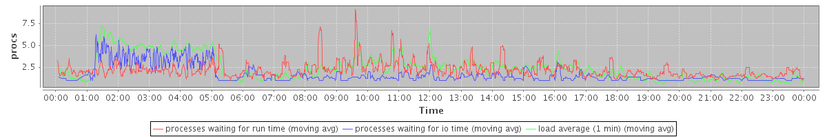 avg(processes waiting for run time) = 1.51 avg(processes waiting for io time) = 0.84 avg(load average (1 min)) = 2.43