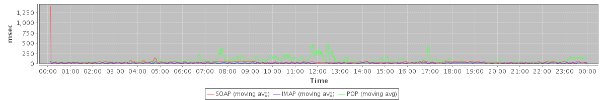 avg(ModifyZimletPrefsRequest) = 251.00 avg(SendMsgRequest) = 278.92 avg(BackupQueryRequest) = 743.67 avg(SendInviteReplyRequest) = 326.25 avg(AutoCompleteRequest) = 565.10 avg(SearchGalRequest) = 687.56 avg(FolderActionRequest.empty) = 368.54 avg(BackupRequest) = 7992.00 avg(SearchCalendarResourcesRequest) = 233.29 avg(GetQuotaUsageRequest) = 4306.00