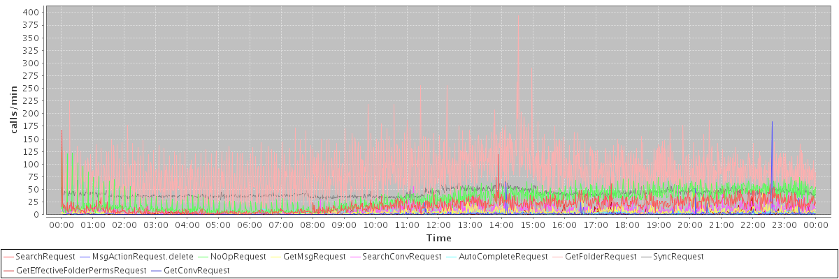 max(SearchRequest) = 168.00 max(MsgActionRequest.delete) = 184.00 max(NoOpRequest) = 138.00 max(GetMsgRequest) = 49.00 max(SearchConvRequest) = 57.00 max(AutoCompleteRequest) = 32.00 max(GetFolderRequest) = 394.00 max(SyncRequest) = 68.00 max(GetEffectiveFolderPermsRequest) = 78.00 max(GetConvRequest) = 100.00