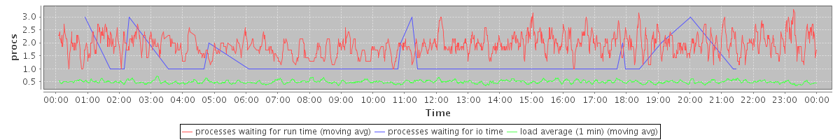 avg(processes waiting for run time) = 1.01 avg(processes waiting for io time) = 0.01 avg(load average (1 min)) = 0.49