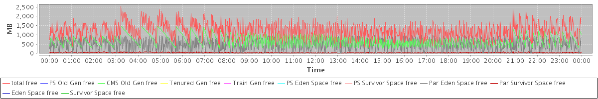 avg(total free) = 1222.10 avg(PS Old Gen free) = 0.00 avg(CMS Old Gen free) = 691.17 avg(Tenured Gen free) = 0.00 avg(Train Gen free) = 0.00 avg(PS Eden Space free) = 0.00 avg(PS Survivor Space free) = 0.00 avg(Par Eden Space free) = 495.06 avg(Par Survivor Space free) = 35.87 avg(Eden Space free) = 0.00 avg(Survivor Space free) = 0.00