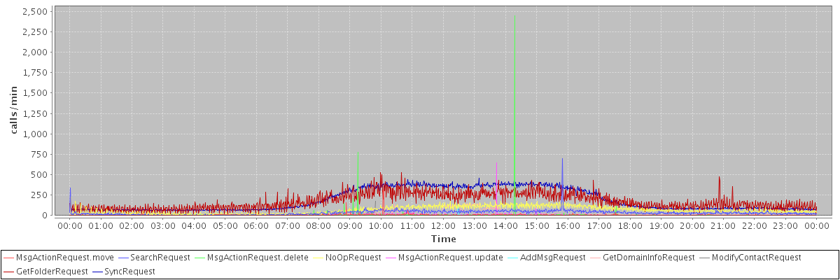 max(MsgActionRequest.move) = 309.00 max(SearchRequest) = 702.00 max(MsgActionRequest.delete) = 2450.00 max(NoOpRequest) = 228.00 max(MsgActionRequest.update) = 650.00 max(AddMsgRequest) = 140.00 max(GetDomainInfoRequest) = 143.00 max(ModifyContactRequest) = 173.00 max(GetFolderRequest) = 529.00 max(SyncRequest) = 455.00