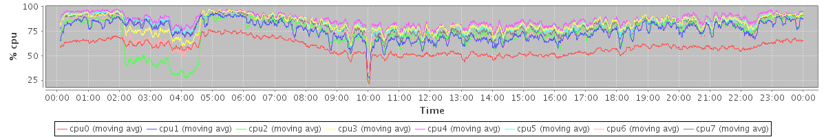 avg(cpu0) = 58.22 avg(cpu1) = 75.19 avg(cpu2) = 72.54 avg(cpu3) = 82.04 avg(cpu4) = 86.00 avg(cpu5) = 82.78 avg(cpu6) = 74.33 avg(cpu7) = 80.54