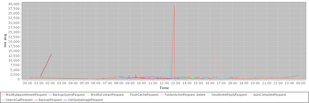 avg(ModifyAppointmentRequest) = 592.06 avg(BackupQueryRequest) = 926.80 avg(ModifyContactRequest) = 384.22 avg(FlushCacheRequest) = 645.00 avg(FolderActionRequest.delete) = 497.67 avg(SendInviteReplyRequest) = 699.00 avg(AutoCompleteRequest) = 566.13 avg(SearchGalRequest) = 499.01 avg(BackupRequest) = 7184.50 avg(GetQuotaUsageRequest) = 1478.00