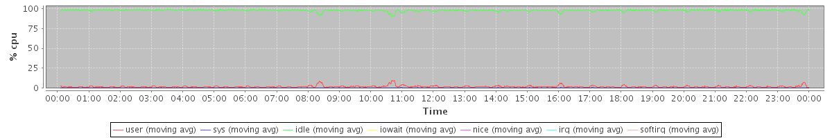 avg(user) = 1.94 avg(sys) = 0.33 avg(idle) = 97.57 avg(iowait) = 0.07 avg(nice) = 0.00 avg(irq) = 0.00 avg(softirq) = 0.10
