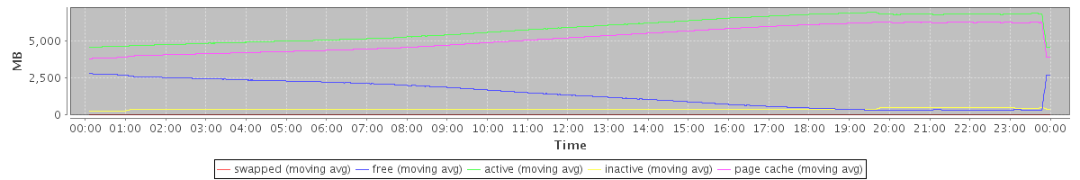 avg(swapped) = 0.20 avg(free) = 1408.83 avg(active) = 5877.96 avg(inactive) = 395.96 avg(page cache) = 5200.30