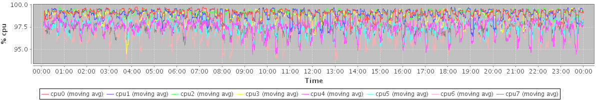 avg(cpu0) = 99.02 avg(cpu1) = 98.96 avg(cpu2) = 99.07 avg(cpu3) = 98.91 avg(cpu4) = 97.41 avg(cpu5) = 97.45 avg(cpu6) = 97.11 avg(cpu7) = 97.45
