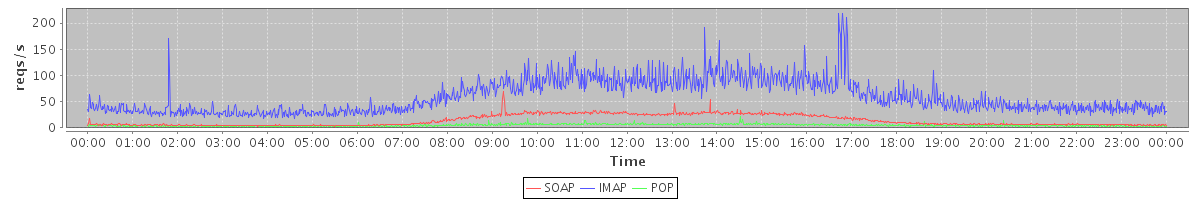 Host zm04.stanford.edu: Mailboxd: Request Rate by Client Protocol