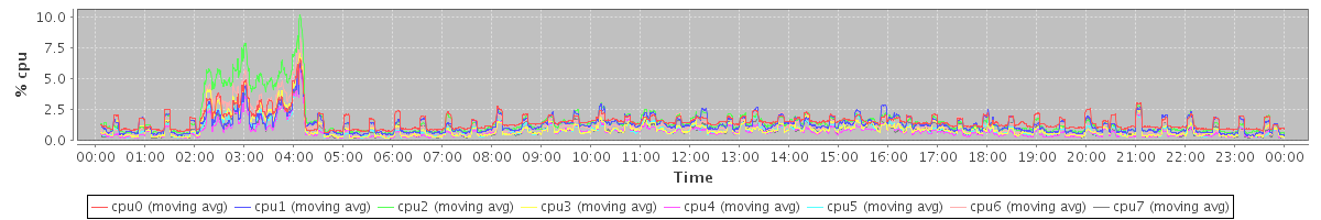 avg(cpu0) = 1.41 avg(cpu1) = 0.27 avg(cpu2) = 0.36 avg(cpu3) = 0.19 avg(cpu4) = 0.14 avg(cpu5) = 0.17 avg(cpu6) = 0.24 avg(cpu7) = 0.18