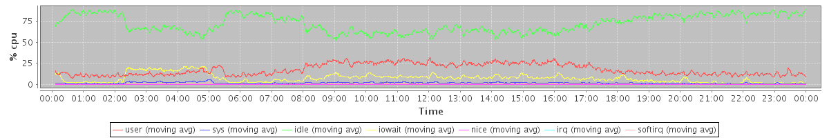 avg(user) = 17.64 avg(sys) = 1.69 avg(idle) = 72.40 avg(iowait) = 7.37 avg(nice) = 0.00 avg(irq) = 0.09 avg(softirq) = 0.82