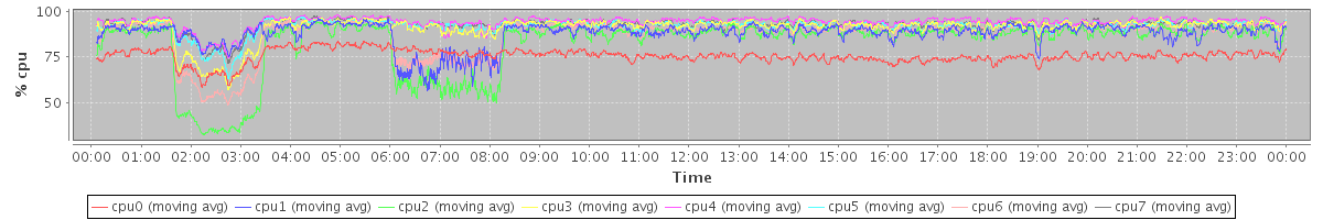avg(cpu0) = 75.68 avg(cpu1) = 87.79 avg(cpu2) = 82.30 avg(cpu3) = 91.14 avg(cpu4) = 94.27 avg(cpu5) = 92.15 avg(cpu6) = 86.83 avg(cpu7) = 92.70