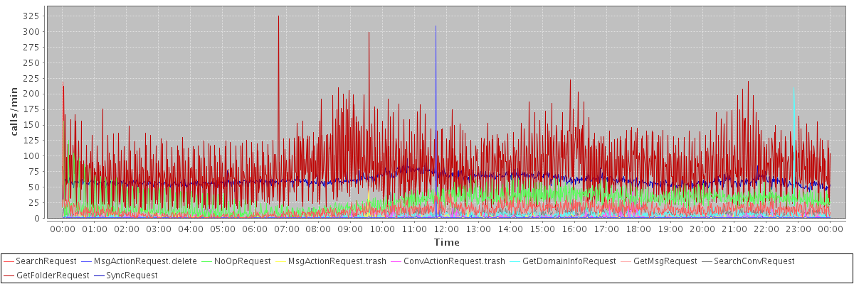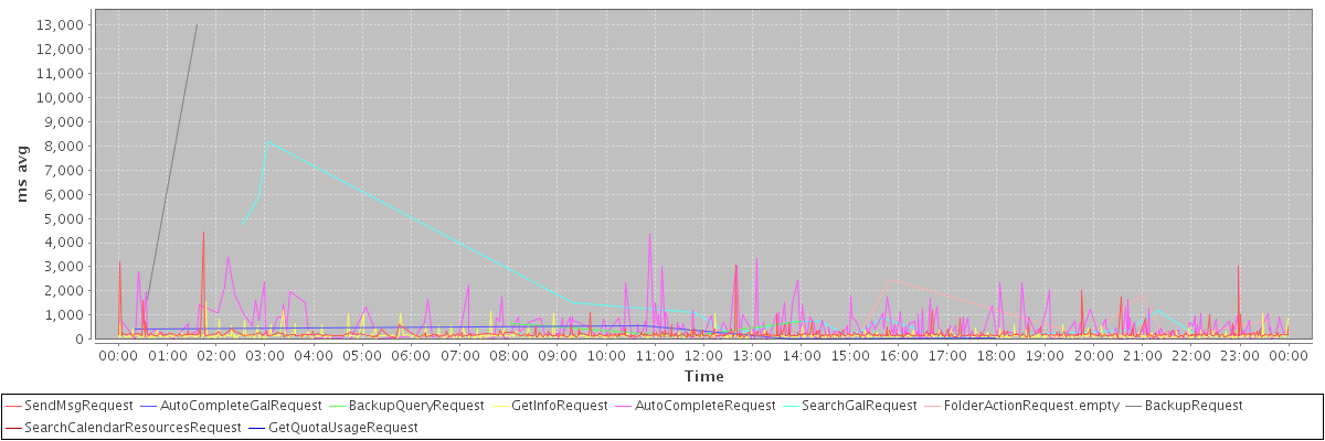 avg(SendMsgRequest) = 227.72 avg(AutoCompleteGalRequest) = 266.00 avg(BackupQueryRequest) = 446.80 avg(GetInfoRequest) = 161.21 avg(AutoCompleteRequest) = 518.57 avg(SearchGalRequest) = 1601.47 avg(FolderActionRequest.empty) = 828.71 avg(BackupRequest) = 7336.00 avg(SearchCalendarResourcesRequest) = 291.00 avg(GetQuotaUsageRequest) = 4115.00