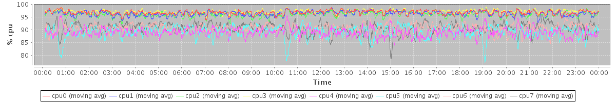 avg(cpu0) = 96.85 avg(cpu1) = 96.43 avg(cpu2) = 96.12 avg(cpu3) = 97.22 avg(cpu4) = 89.04 avg(cpu5) = 89.10 avg(cpu6) = 90.69 avg(cpu7) = 90.71